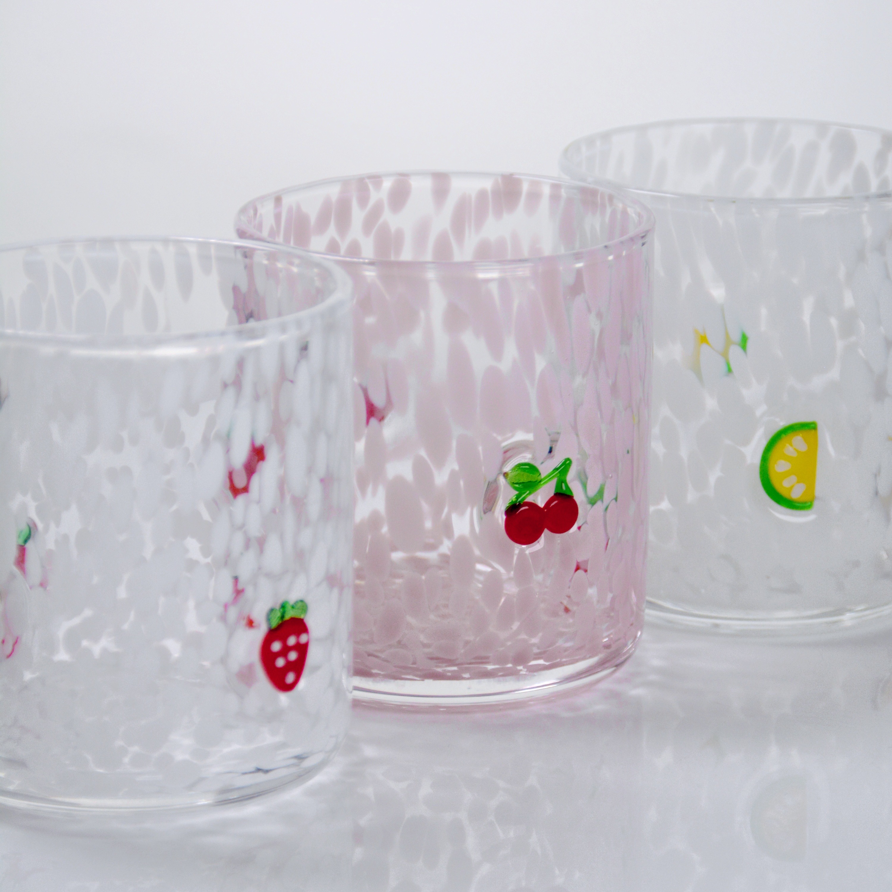 Este vaso, con su base de confeti rosa oscuro y un par de cerezas gordas y brillantes, es a la vez juguetón y sofisticado.Ya sea que esté disfrutando de una clásica cherry cola o una Manhattan, este vaso es seguro de ser la estrella de su colección de bebidas.